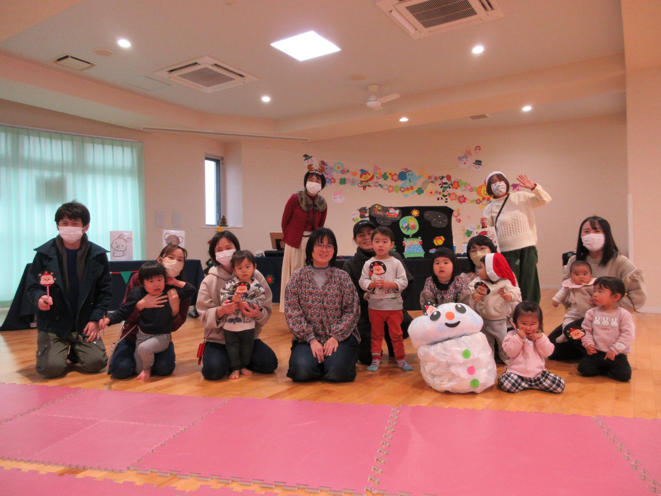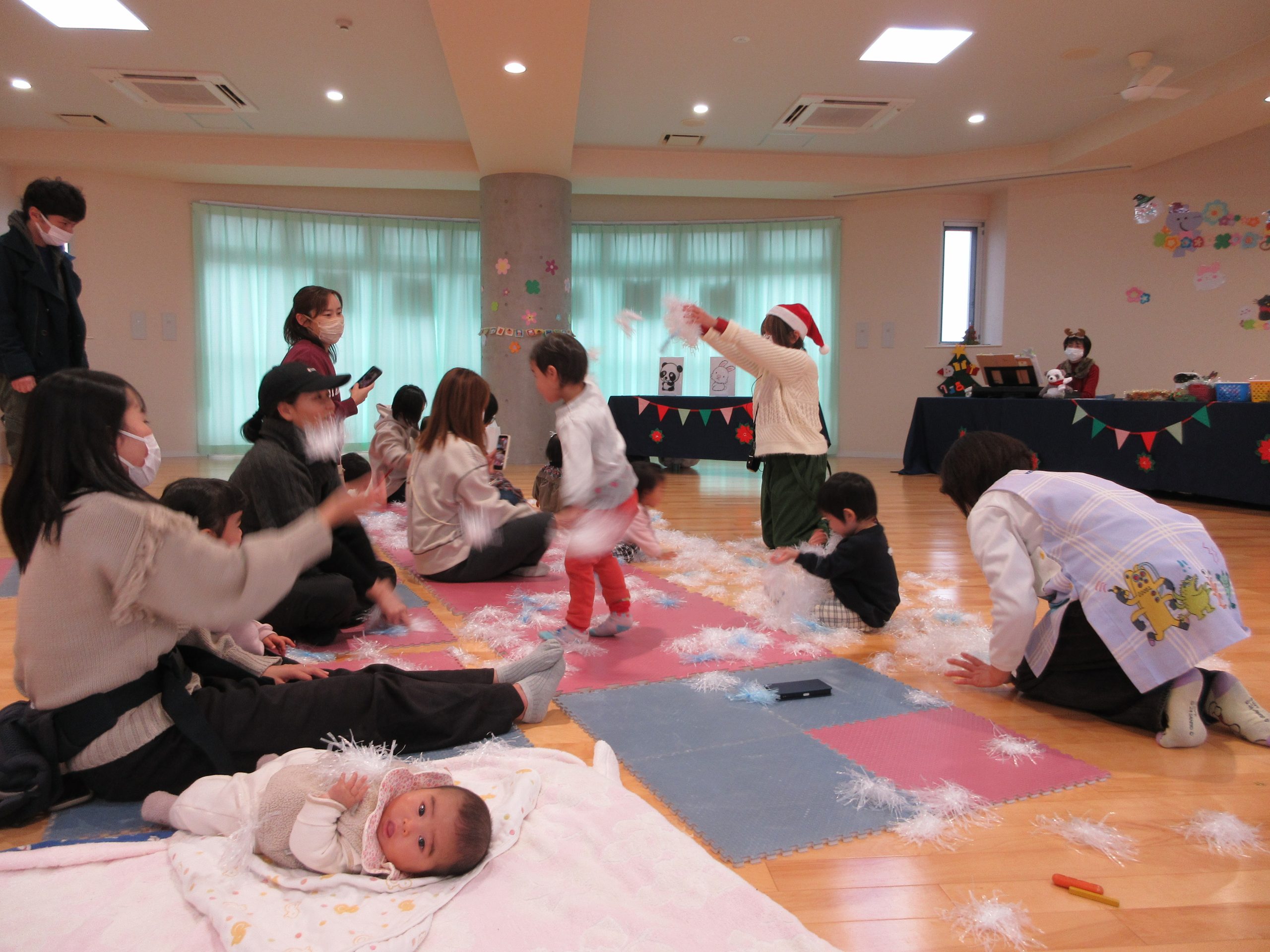 音楽療法セラピストの武井えりかさんと高橋みゆきさんをお迎えして、クリスマスコンサートを開催しました。クリスマスの歌に合わせて、ママの膝で体を動かしたり、手遊びしたり、ダンスをしていました。雪遊びをイメージした遊びも楽しんで、最後に雪だるまを作りました。