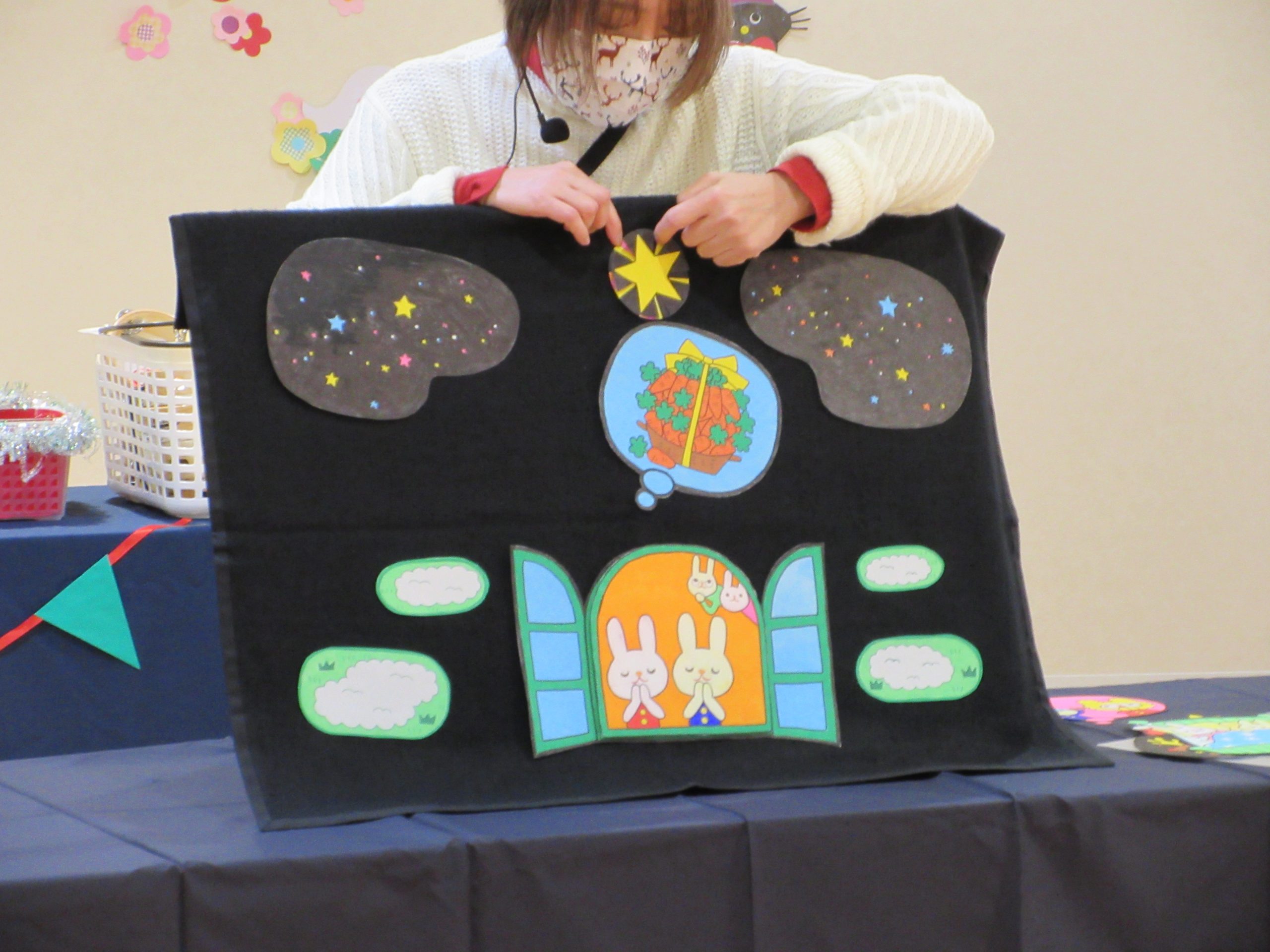 パネルシアター「うさぎ野原のクリスマス」を真剣に見ていました。