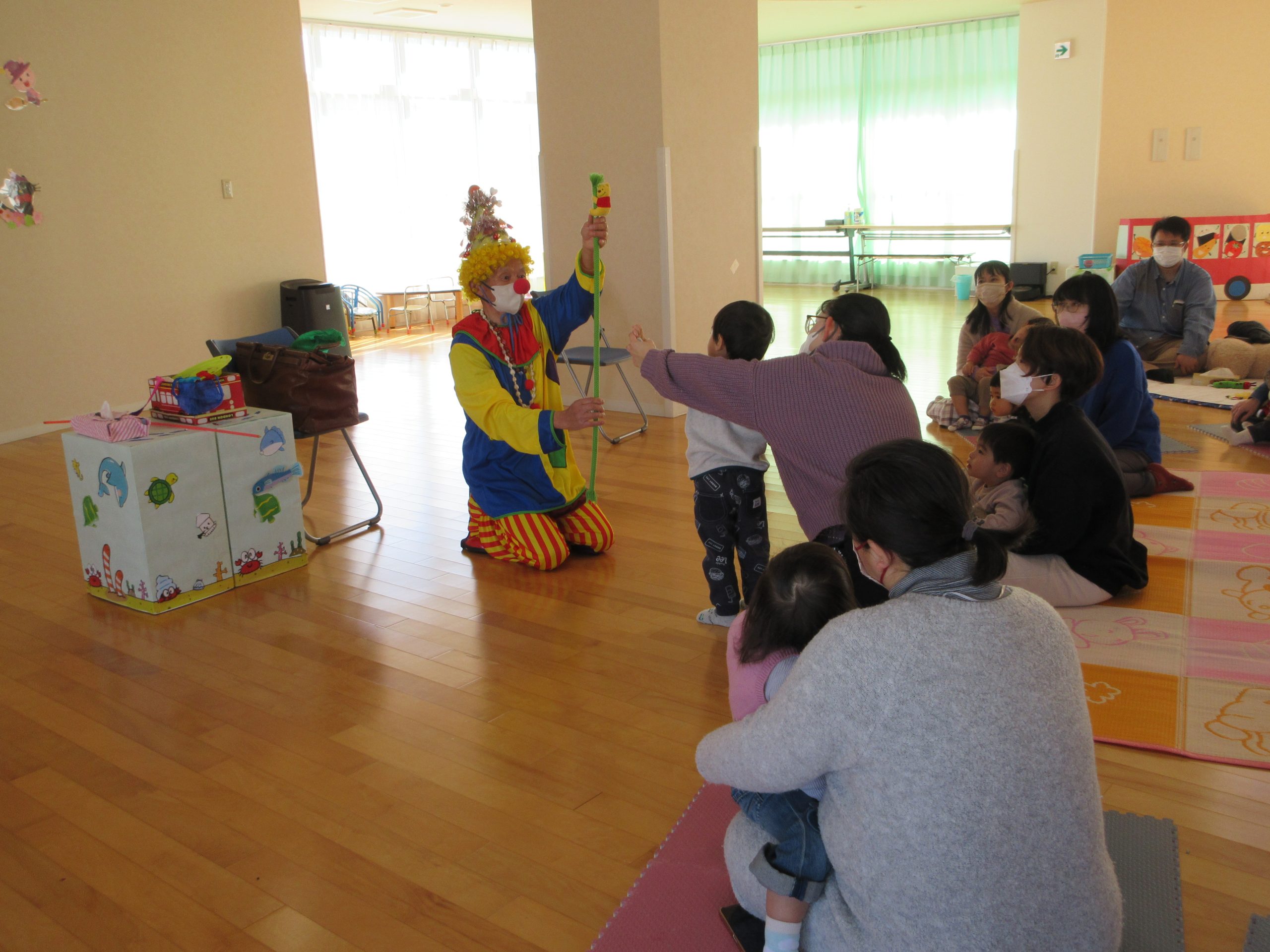 クラウン・コバ はカラフルな衣装を身にまとい、郷ひろみの曲で登場。「お嫁サンバ」の歌で、すっかり会場は明るく楽しい雰囲気に包まれました。くるみ保育園の子も参加して、じっと見ていました。子どもたちに参加させてくださるので、最後まで真剣に見入っていました。
