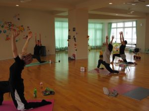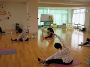 人気の講座、今回もアロマの香り漂う中、素敵な曲を流して、リフレッシュできました。ウエストをひねって腕を左右に動かすだけでも気分はすっきりするとの事、日常の合間にちょこっとヨガができるといいですね。子どもたちは、ママの近くを行ったり来たり、遊びながら待っていました。