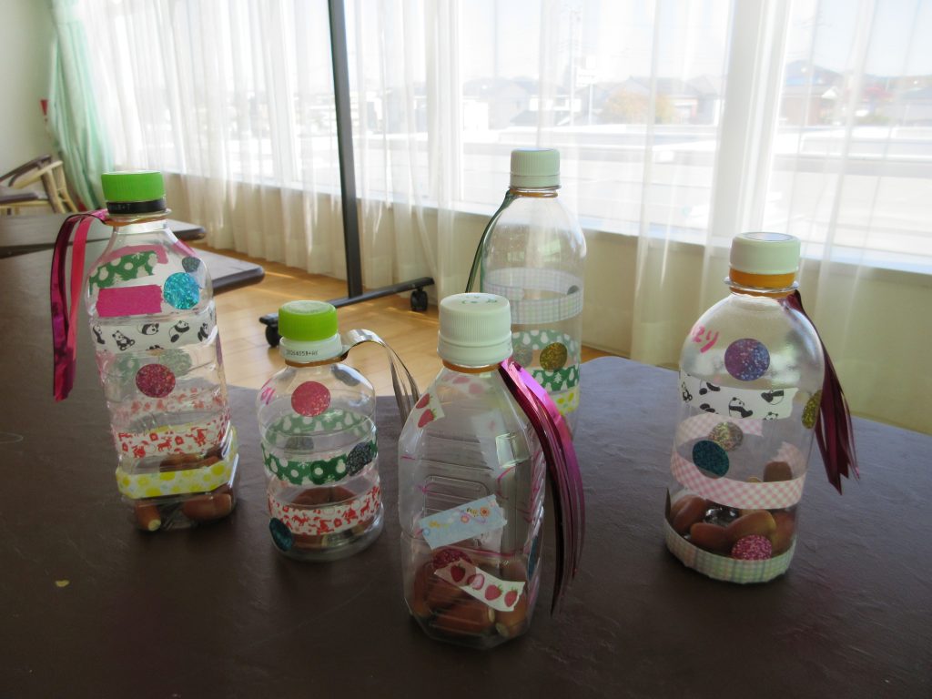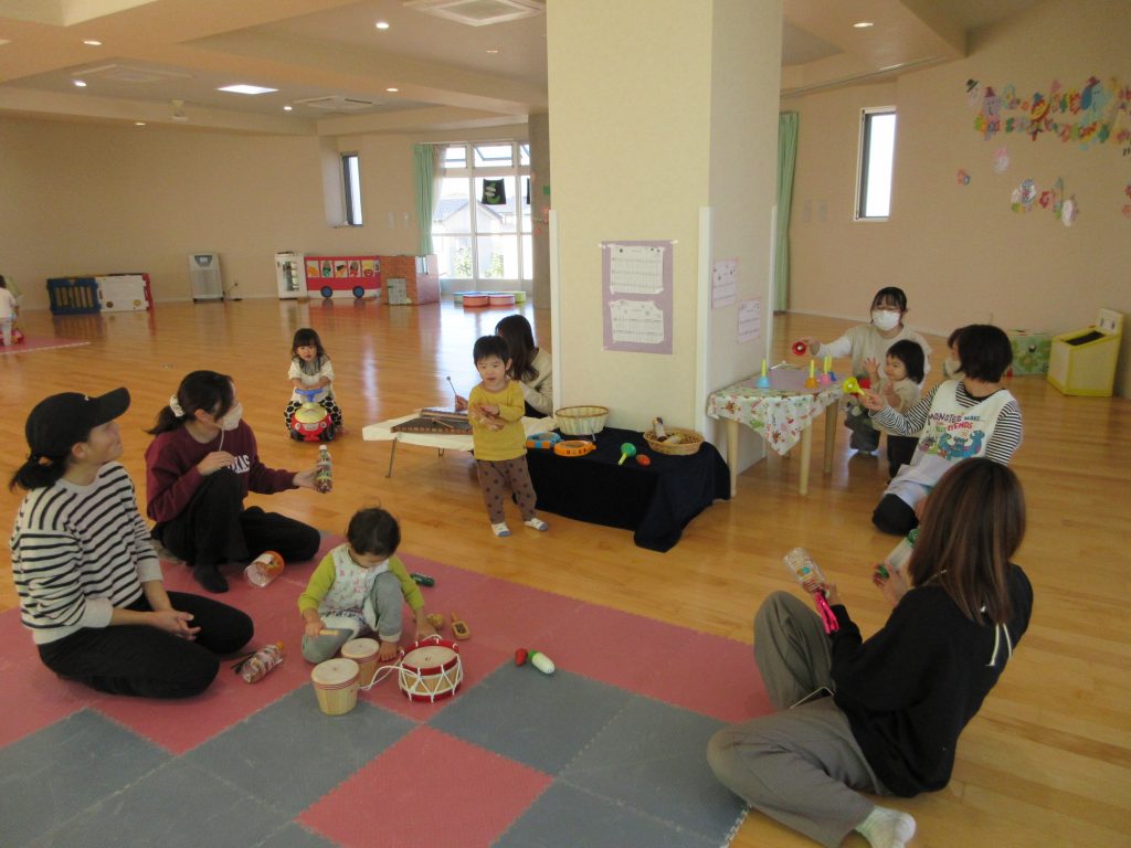 ペットボトルにどんぐりをいれてマラカスを作った。小さな手に大きなドングリは持つのに丁度よく、入れるのを繰り返し楽しむ子もいた。また、キッズ向けの楽器もフルーツ野菜のマラカス、動物のタンバリン、シロフォン、ハンドベルなども持つだけでも楽しいようであった。最後に皆で曲に合わせて演奏をした。太鼓を下げて演奏しながら更新するのを楽しんだ。