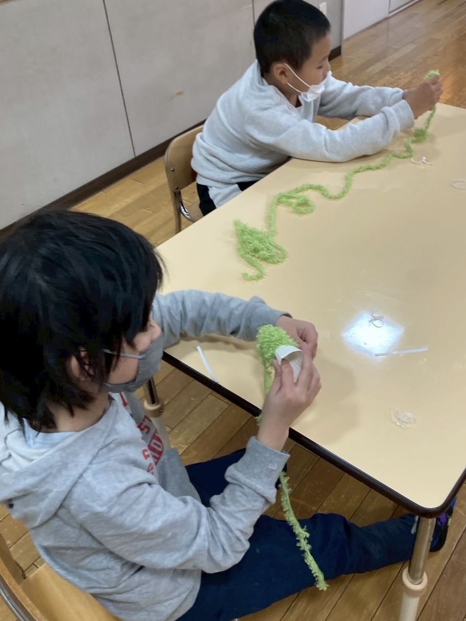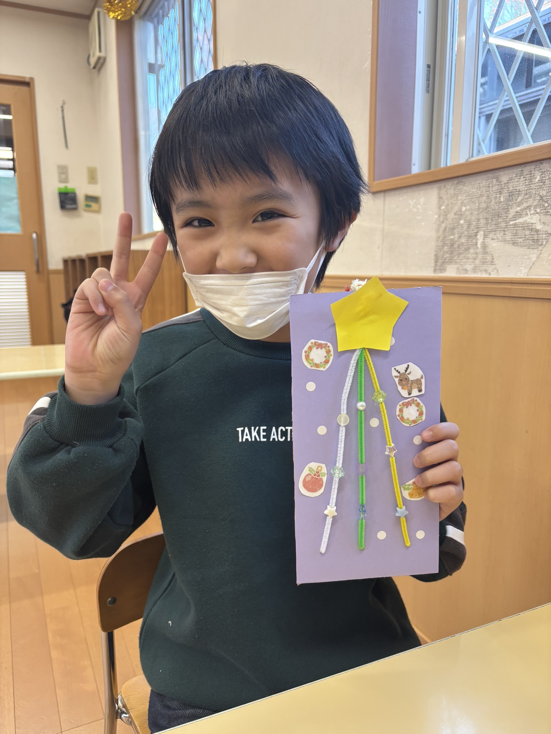 地域小グループでは、毛糸を巻いて世界に一つだけのクリスマスツリーを作りました!