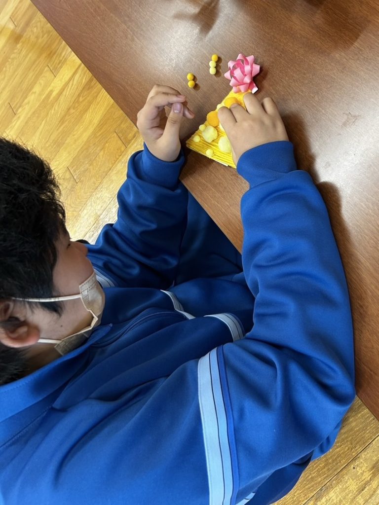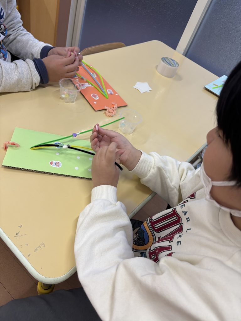 足中特グループでは、モールにビーズを通してクリスマスツリーを作りました!