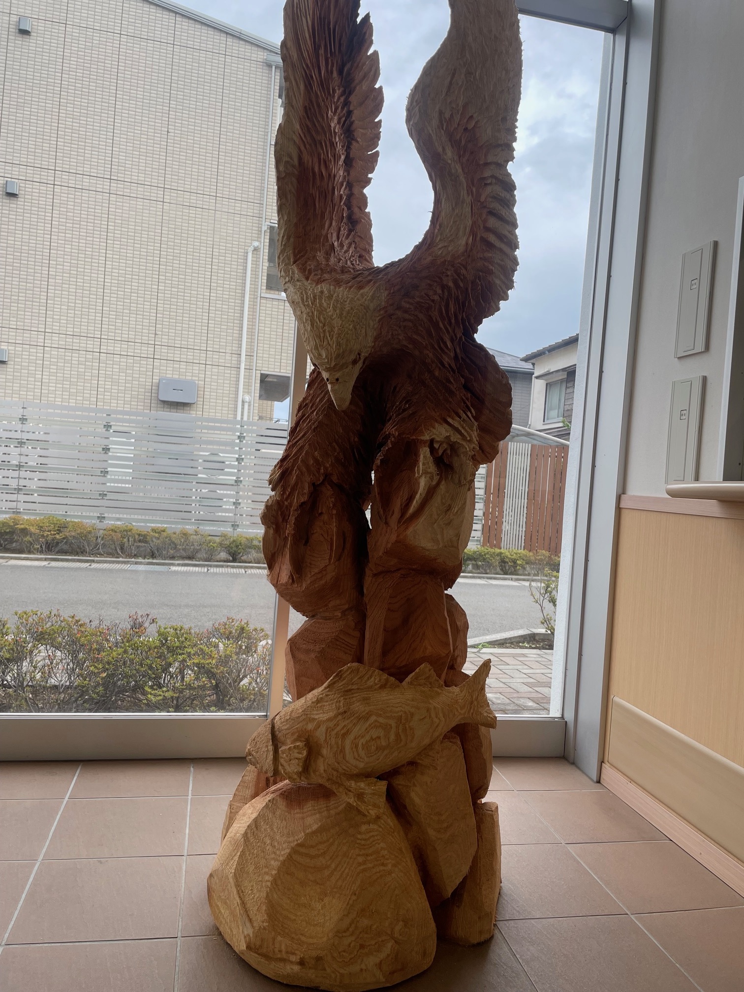 2025年11月2日(日)に行われました「どまんなかフェスタ佐野2025」の「チェーンソーアート」の作品がフロム浅沼にやってきました。作者は、2007~2009年にはカナダブリティッシュコロンビア州にて行われたチェーンソーアートの世界大会「ChetwyndInternational Chainsaw Carving Championship」で3連覇された栗田宏武(くりたひろむ)さんです。2005年にTVチャンピオン「ログハウス王選手権」で優勝された方でもあります。作品はイーグルが羽を広げた迫力ある作品です。フロム浅沼の玄関に展示されています。是非、ご覧ください。