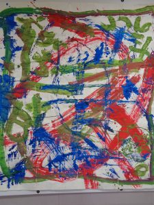 新年、みんなで協力して書き上げた大筆の書道は、