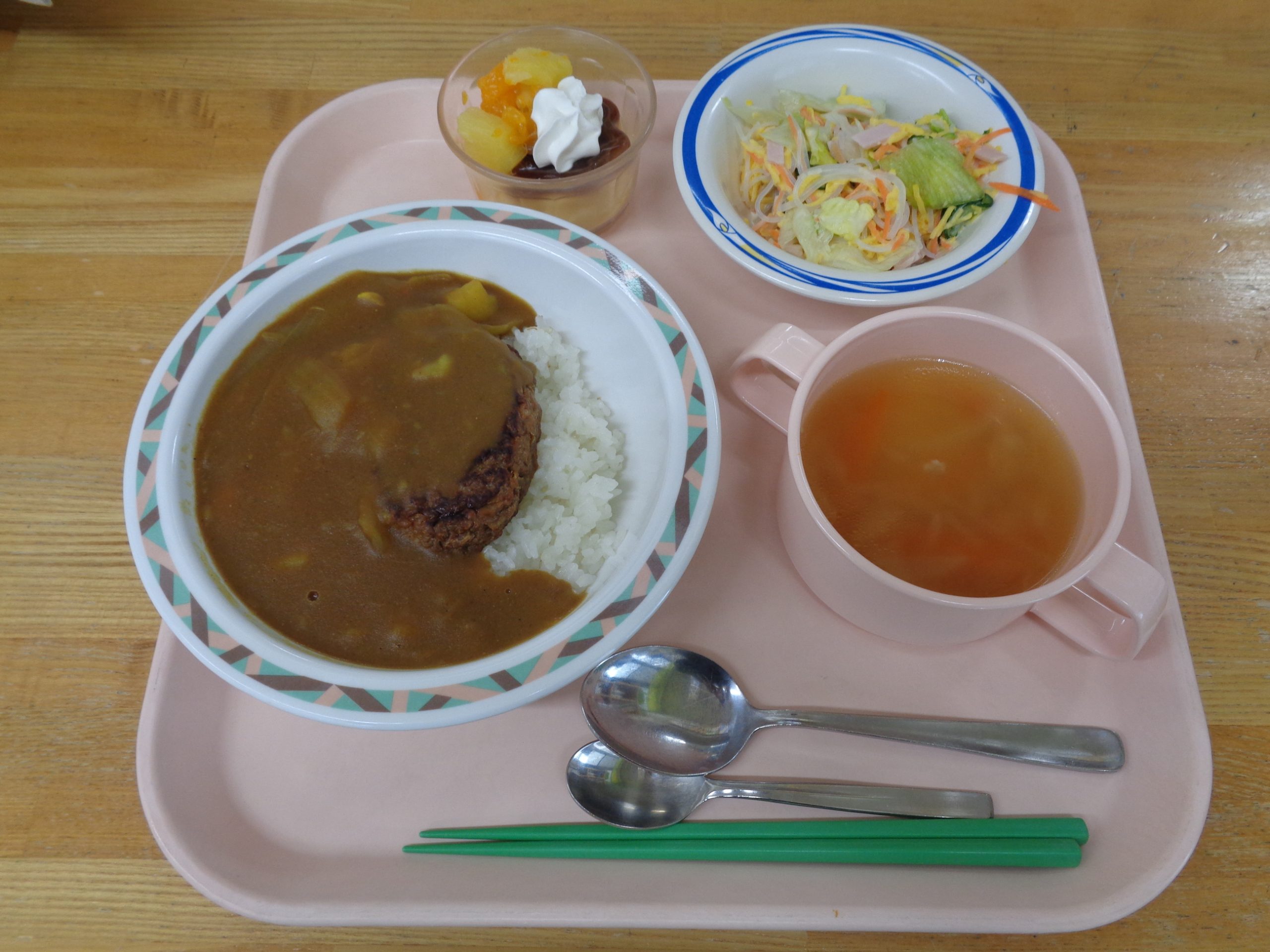 ハンバーグカレー、春雨サラダ、コンソメスープにプリンアラモード。