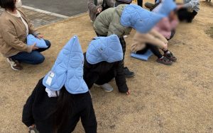 サイレンの音がなると職員の指示を聞きながら防災頭巾を被り、