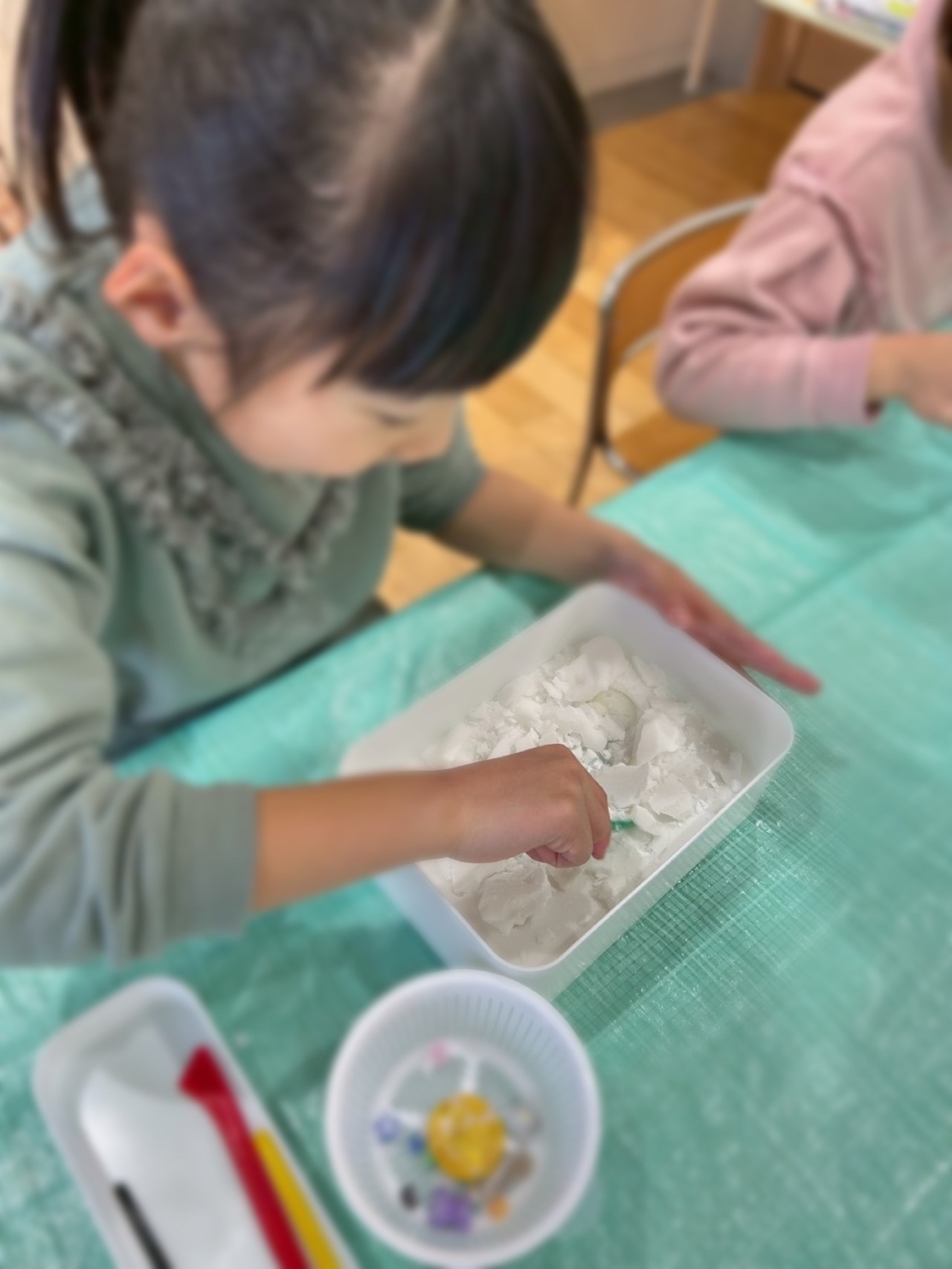 この日の内容は、【宝探し】をテーマに固めた片栗粉を粘土ヘラを上手に使って、ビーズや貝殻をなどを掘り出す作業を行いました。