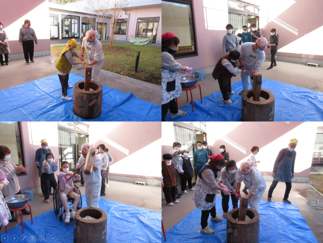 12/26(金)に晴天の下、毎年恒例のもちつきを行いました。全員にもちをついてもらい、皆さんの笑顔が印象的なもちつきとなりました。